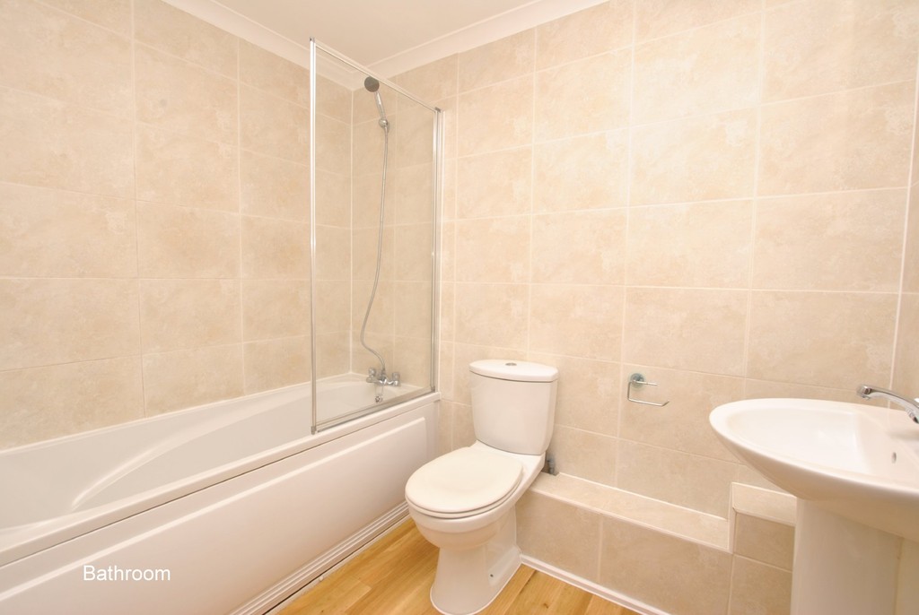 BATHROOM Updated bathroom with white suite comprising panelled bath with mixer taps, shower fittings and shower screen. Pedestal basin and WC, neutral tiles and chrome ladder style towel rail.
